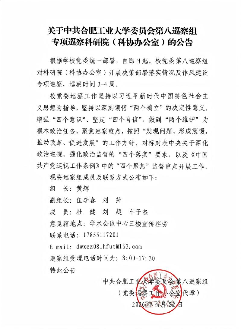 关于中共合肥工业大学委员会第八巡察组专项巡察科研院(科协办公室)的公告